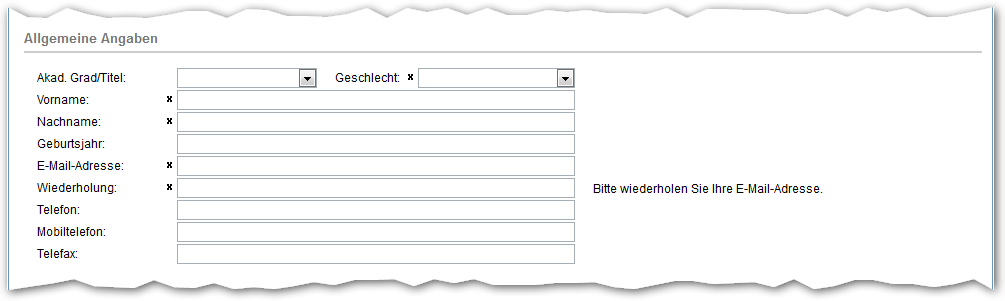 Zwingend Angaben sind in den Feldern "Vorname:", "Nachname:", "Geschlecht:" sowie im Feld "E-Mail-Adresse:" zu machen. Die hier angegebene E-Mail-Adresse wird später für die elektronische Kommunikation mit Ihnen verwendet. Um sicherzugehen, dass die E-Mail-Adresse richtig eingegeben wird, müssen Sie diese im Feld "Wiederholung:" ein zweites Mal eingeben.