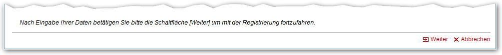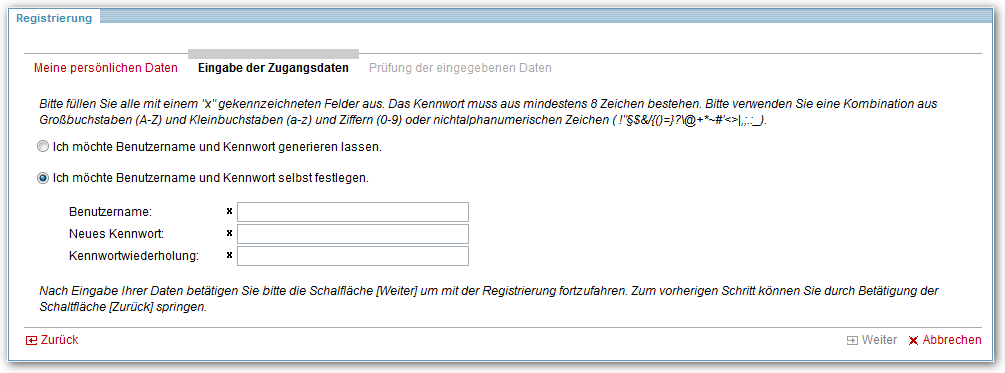 In diesem Fall werden Benutzername und Kennwort nach internen Richtlinien automatisch erzeugt und nach erfolgreicher Registrierung an die von Ihnen hinterlegte E-Mail-Adresse gesendet. Mit dem Funktionslink Weiter können Sie in die nächste Registerkarte wechseln.