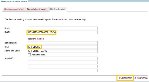 Wenn Sie über den Link BANKVERBINDUNG in den nächsten Reiter wechseln, können Sie hier Ihre Angaben zur Bankverbindung einsehen und bearbeiten. Die Bankdaten werden für die Auszahlung der Reisekosten und Honorare zwingend benötigt und sind in Ihren Stammdaten genau dann vorhanden, wenn Sie bereits solche Zahlungen erhalten haben.