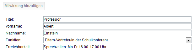 Für die öffentlich sichtbaren Daten zu Mitwirkungsgremien gilt: Es können Mitglieder der Schulkonferenz, Eltern- und Schülersprecher erfasst werden. Pflichtfelder sind hier Vorname, Nachname und Funktion. Die Funktion wird aus einem Drop-Down-Menü gewählt. Die Anzeige im Schulporträt erfolgt nach den Kategorien Elternmitwirkung, Schülermitwirkung und Schulkonferenz. Die Zuordnung geschieht automatisch. Sollte eine Person mehrere Funktionen wahrnehmen, muss sie mehrfach erfasst und entsprechend verschiedenen Funktionen zugeordnet werden.