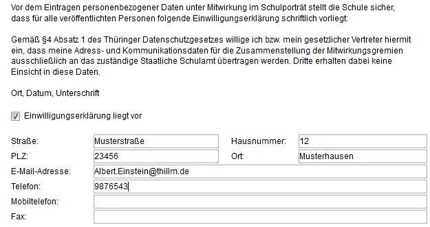Neben den Angaben zu Vorname, Nachname und Funktion können auch Adress- und Kommunikationsdaten der Person erfasst werden. Da diese personenbezogenen Daten zwar nicht öffentlich sind und auch ausschließlich im System TSP verbleiben, aber von Berechtigten in den Staatlichen Schulämtern eingesehen werden können, ist es notwendig, alle betroffenen Personen über die Datensicht durch Dritte zu informieren und ein entsprechendes Einverständnis einzuholen. Das Anhaken der Einwilligungserklärung ist aus diesem Grund eine Pflichtangabe.
