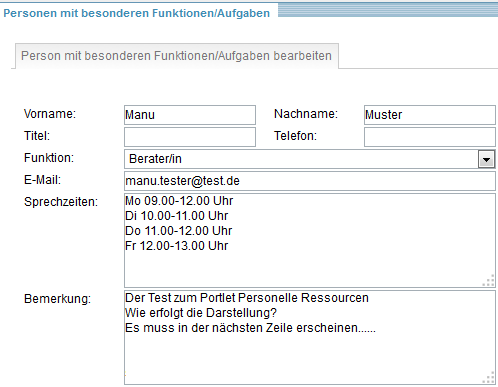 Dabei sind Vorname, Nachname und Funktion Pflichtfelder. Bei der Telefonnummer können Sie die Vorwahl durch ein beliebiges Zeichen von der Hauptnummer trennen (  zum Beispiel  012 345 / 123 456 ).