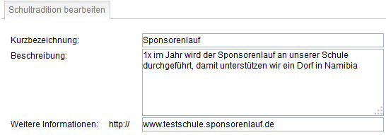 Kurzbezeichnung (Name der Schultradition) und Beschreibung sind Pflichtfelder.