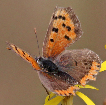 Das Foto gehört zur Serie "Schmetterlinge". Es zeigt einen Kleinen Feuerfalter (Lycaena phlaeas). Dieser Schmetterling ist ein Tagfalter aus der Familie der Bläulinge. Es gelten die Nutzungsbedingungen der Mediothek und Pixiothek.