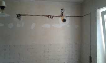 Das Foto gehört zur Serie "Elektrik". Abgebildet ist die Verlegung einer ehemaligen Doppelsteckdose (Mitte) zu zwei Einzelsteckdosen sowie die vorbereitete Ergänzung mit zwei Hohlraumdosen (rechts). Es gelten die Nutzungsbedingungen der Mediothek und Pixiothek.