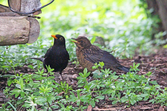 Amselmännchen und Jungvogel