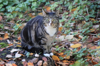 Das Foto gehört zur Serie "Bauernhof". Es zeigt eine Hauskatze zwischen Blättern. Das Bild ist unter CC0 lizenziert und kann somit frei verwendet werden.