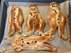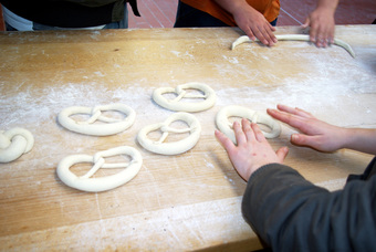 Das Bild zeigt einen bemehlten Tisch, auf dem aus Teig Brezeln zum Backen geformt werden. Das Bild ist unter CC0 lizenziert und kann somit frei verwendet werden.