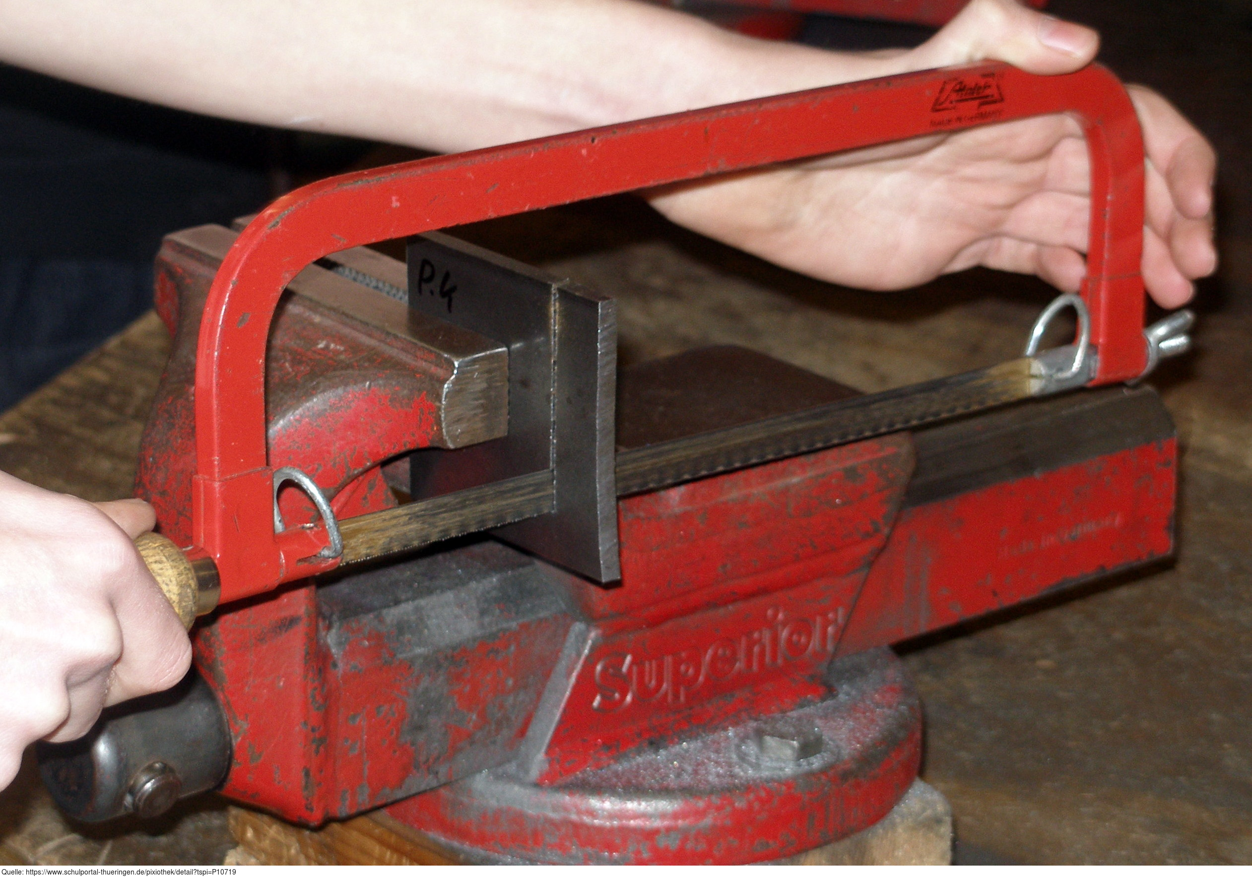 Das Bild gehört zur Serie "Werkzeuge". Es zeigt die Verwendung einer Metallbügelsäge beim Bearbeiten einer im Schraubstock eingespannten Metallplatte. Das Bild ist unter CC0 lizenziert und kann somit frei verwendet werden.