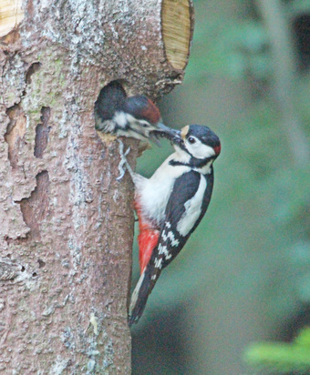 Buntspecht, Altvogel füttert Jungvogel