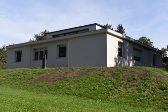 Das Foto gehört zur Serie "Bauhaus in Weimar". Das Musterhaus „Am Horn“ ist ein in Weimar errichtetes Versuchshaus des Staatlichen Bauhauses. Es war ein zentrales Element der ersten Bauhaus-Ausstellung vom 15. August bis 30. September 1923. Für das Bauhaus-Versuchshaus wurde der Entwurf von Georg Muche realisiert. Die praktische Umsetzung des Entwurfs Muches besorgten Walter March und Adolf Meyer vom Gropius’ Architekturbüro. Die Ausstattung basierte auf einem Gemeinschaftswerk aller Werkstätten des Bauhauses.