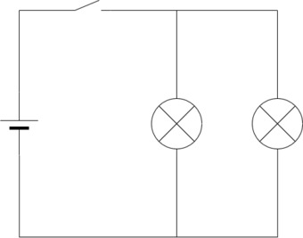 Das Bild gehört zur Serie "Elektrische Schaltungen". Es zeigt den Schaltplan einer Parallelschaltung mit Spannungsquelle (Batterie), Schalter und zwei Verbrauchern (Glühlampen). In dieser Version wurden die Verbindungsknoten nicht eingezeichnet. Das Bild ist unter CC0 lizenziert und kann somit frei verwendet werden.