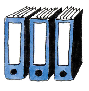 Das Bild gehört zur Serie "Schreibwaren". Es zeigt gezeichnete Ordner. Es gelten die Nutzungsbedingungen der Mediothek und Pixiothek.