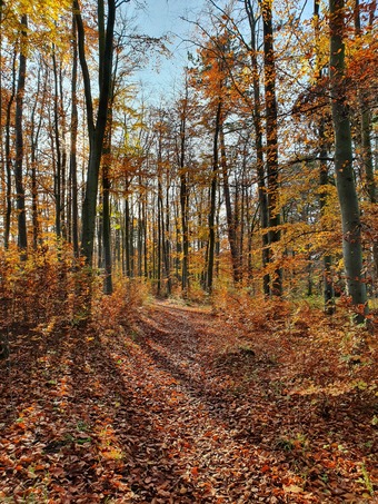 Herbstsonne wirft lange Schatten und verzaubert den Wald in ein buntes Farbenmeer. Es gelten die Nutzungsbedingungen der Mediothek und Pixiothek.