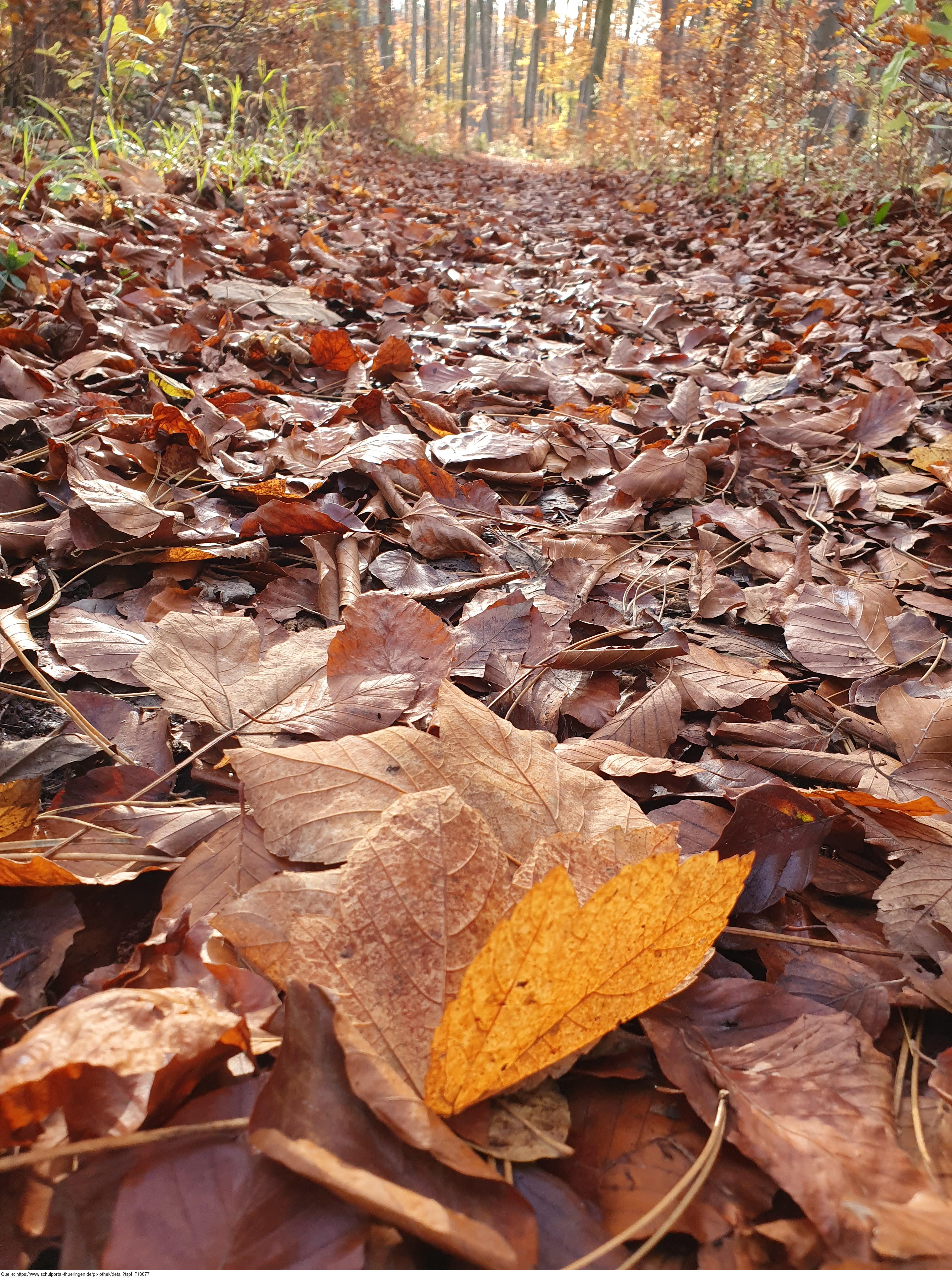 Ein gelbes Blatt ziert einen Weg mit altem Laub. Es gelten die Nutzungsbedingungen der Mediothek und Pixiothek.
