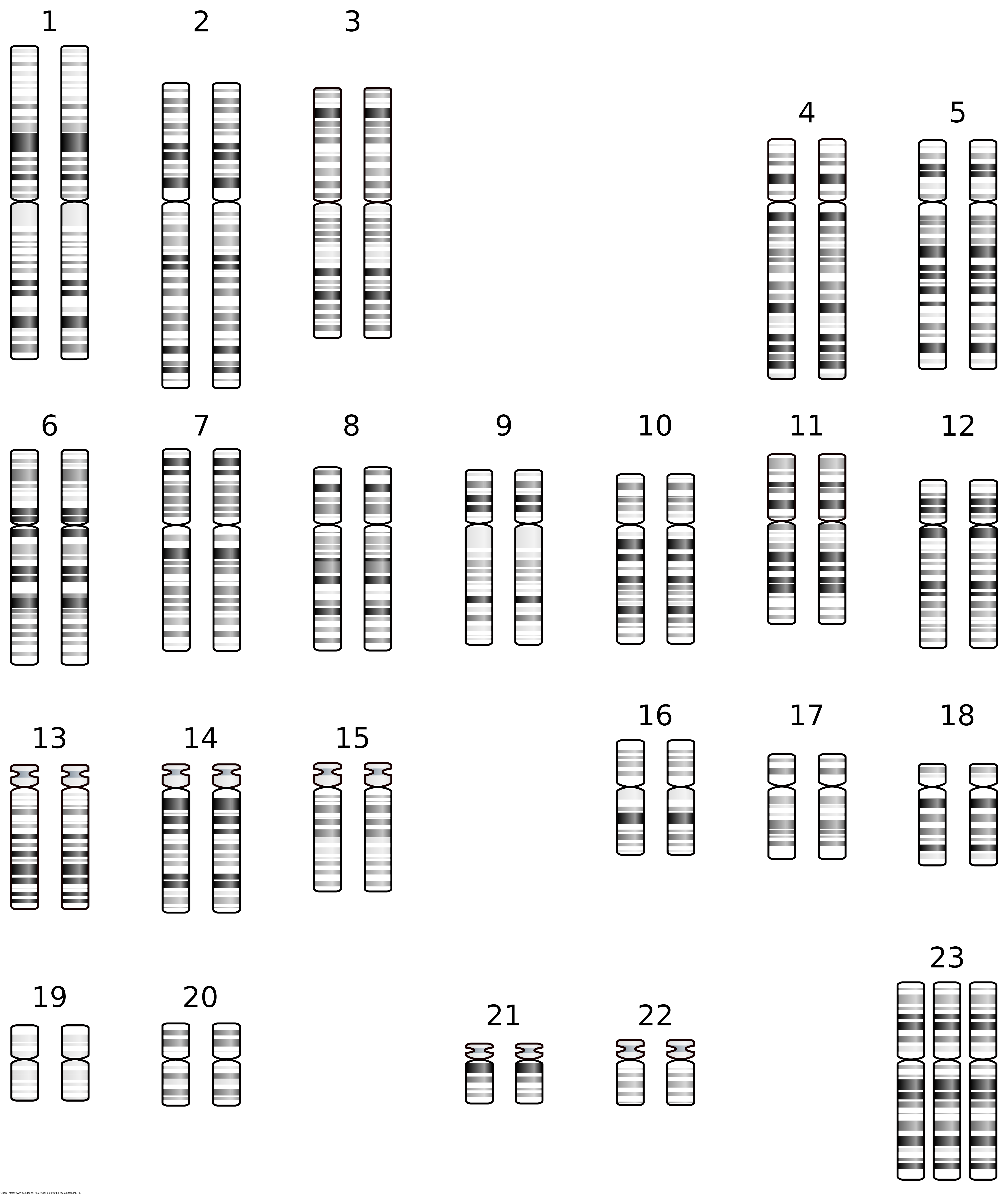 Karyogramm einer Frau mit Super-Female-Syndrom / Triple-X-Syndrom. Es gelten die Nutzungsbedingungen der Mediothek und Pixiothek. Auf http://unterricht.petzinger.net/biochdropbox.html auch als svg und in CC-BY verfügbar.