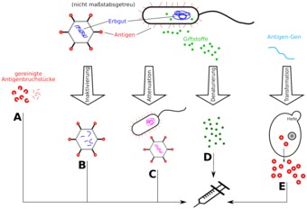 Klassische Wege Impfstoffe zu gewinnen (Antigenbruchstück, Inaktivierung, Attenuation, Denaturierung, gentechnische Produktion von Antigenen). Es gelten die Nutzungsbedingungen der Mediothek und Pixiothek. Auf http://unterricht.petzinger.net/biochdropbox.html auch als svg und in CC-BY verfügbar.