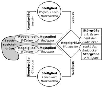 Doppelter Regelkreis der Bauchspeicheldrüse. Es gelten die Nutzungsbedingungen der Mediothek und Pixiothek. Auf http://unterricht.petzinger.net/biochdropbox.html auch als svg und in CC-BY verfügbar.