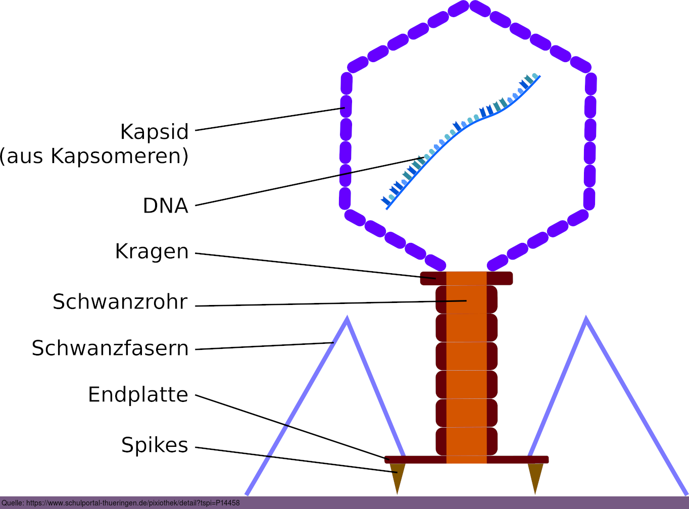 Molekularer Aufbau eines Bakteriophagen. Es gelten die Nutzungsbedingungen der Mediothek und Pixiothek. Auf http://unterricht.petzinger.net/biochdropbox.html auch als svg und in CC-BY verfügbar.