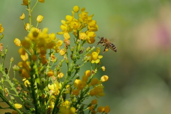 Das Foto gehört zur Serie "Bienen". Es zeigt eine Biene mit Pollenhöschen beim Sammeln von Pollen und Nektar. Das Bild ist unter CC0 lizenziert und kann somit frei verwendet werden.