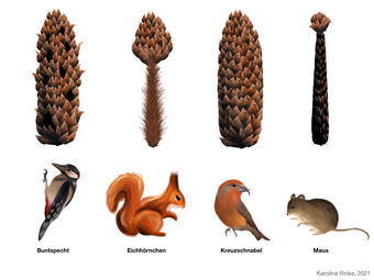 Die Grafik gehört zur Serie "Fraßspuren". Dargestellt sind Zapfenfraßspuren von Maus, Eichhörnchen, Buntspecht und Fichtenkreuzschnabel in richtiger Zuordnung, farbig. Es gelten die Nutzungsbedingungen der Mediothek und Pixiothek.