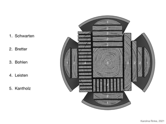 Die Grafik gehört zur Serie "Holzbearbeitung". Dargestellt sind Arten von Schnittholz, die in einem Sägewerk aus einem Baumstamm hergestellt werden, Bild-Variante: s/w, mit Beschriftung. Es gelten die Nutzungsbedingungen der Mediothek und Pixiothek.