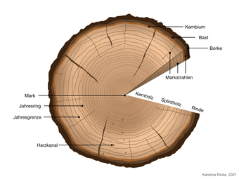 Die Grafik gehört zur Serie "Holz". Das Bild zeigt den Querschnitt eines Baumstammes, farbig, mit Beschriftung. Es gelten die Nutzungsbedingungen der Mediothek und Pixiothek.