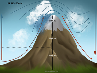 Das Bild gehört zur Serie "Grafische Darstellung Alpenföhn". Das Bild verdeutlicht den Alpenföhn (Föhnwind des Alpenraumes). Bild-Variante: Berg mit Wolken und Niederschlag; farbig; mit Pfeilen zur Beschriftung. Es gelten die Nutzungsbedingungen der Mediothek und Pixiothek.