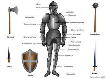Das Bild zeigt einen Ritter in Rüstung und mit Ausrüstung. Bild-Variante: farbig; beschriftet. Es gelten die Nutzungsbedingungen der Mediothek und Pixiothek.