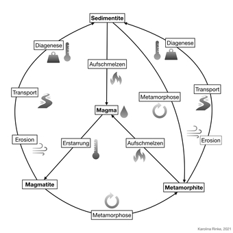 Das Bild verdeutlicht den Gesteinskreislauf. Bild-Variante: s/w; beschriftet. Es gelten die Nutzungsbedingungen der Mediothek und Pixiothek.