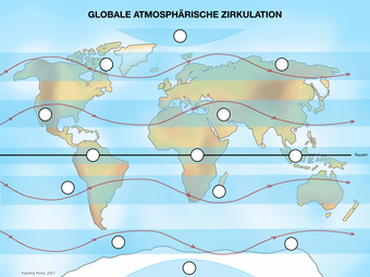 Das Bild gehört zur Serie „Zirkulationssysteme der Erde“. Es verdeutlicht die globale atmosphärische Zirkulation der Erde. Bild-Variante: farbig; leere Vorlage. Es gelten die Nutzungsbedingungen der Mediothek und Pixiothek.