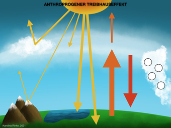 Das Bild verdeutlicht den anthropogenen Treibhauseffekt. Bild-Variante: farbig; unbeschriftet. Es gelten die Nutzungsbedingungen der Mediothek und Pixiothek.
