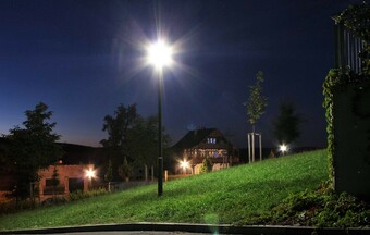 Motiv eines Stadtrundganges durch Pößneck (Ostthüringen) bei Nacht. Abgebildet ist das sogenannte Schweizer Haus, ein 1895/96 in alpenländischem Stil errichtete Stadthaus des Textilfabrikanten Bernhard Siegel. Es gelten die Nutzungsbedingungen der Mediothek und Pixiothek.