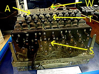 Ansicht der Enigma-Verschlüsselungsmaschine. Es sind folgende Teile beschriftet: T - Tastaturc, A - Anzeige, W - Walzen, S - Steckerfeld.