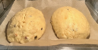 Weihnachtsstollen, frische Teiglinge im Ofen