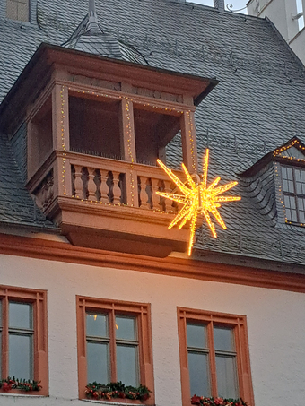 Das Foto gehört zur Serie "Weihnacht". Es zeigt einen beleuchteten Weihnachtsstern am Rathaus von Pößneck. Es gelten die Nutzungsbedingungen der Mediothek und Pixiothek.