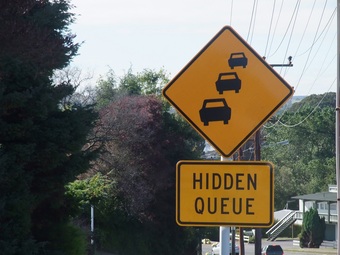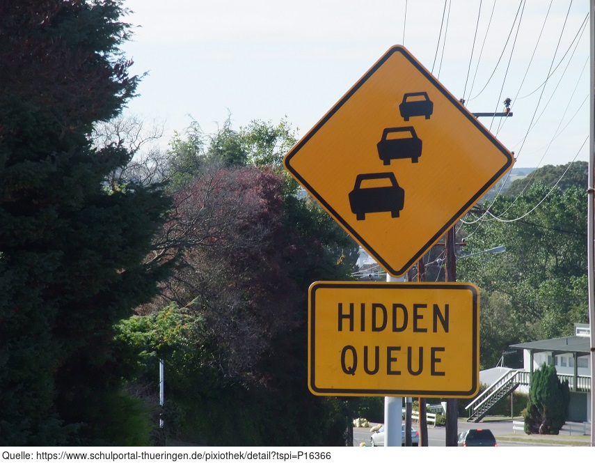 Verkehrszeichen mit Hinweis auf einen möglichen Stau hinter einer Kurve. aufgenommen in Neuseeland. Das Bild ist eine mögliche Illustration des Informatik-Begriffs queue.