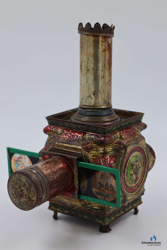 Abgebildet ist eine Laterna magica aus der Sammlung des Schulmuseums Friedrichshafen. Sie stammt aus der Mitte des 19. Jahrhunderts und hat ein reich verziertes, buntes Metallgehäuse. Auf den zugehörigen Glasbildern sind Szenen aus dem Märchen „Der Rattenfänger von Hameln“ abgebildet. Weitere Erläuterungen zum Bild unter https://schulmuseum.friedrichshafen.de/das-museum/ausstellungen/objekt-des-monats/detailseite/news/laterna-magica-aus-dem-19-jahrhundert/.