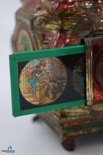 Abgebildet ist eine Laterna magica aus der Sammlung des Schulmuseums Friedrichshafen. Sie stammt aus der Mitte des 19. Jahrhunderts und hat ein reich verziertes, buntes Metallgehäuse. Auf den zugehörigen Glasbildern sind Szenen aus dem Märchen „Der Rattenfänger von Hameln“ abgebildet. Weitere Erläuterungen zum Bild unter https://schulmuseum.friedrichshafen.de/das-museum/ausstellungen/objekt-des-monats/detailseite/news/laterna-magica-aus-dem-19-jahrhundert/.