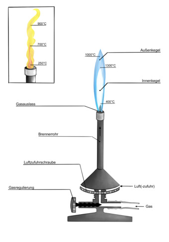 Das Bild verdeutlicht den Aufbau eines Bunsenbrenners. Variante: zwei Flammen, farbig; beschriftet. Es gelten die Nutzungsbedingungen der Mediothek und Pixiothek.
