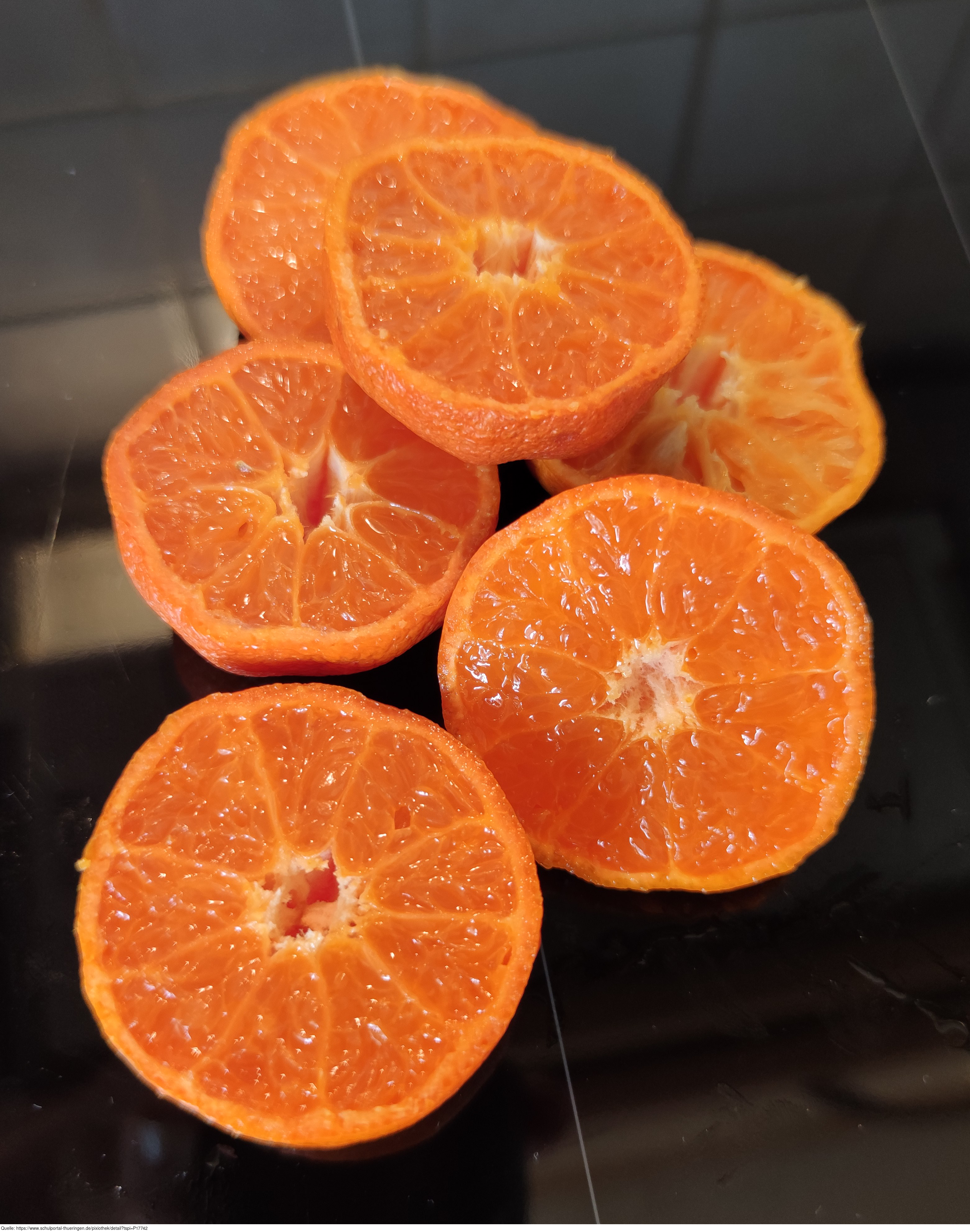 Das Bild gehört zur Serie "Obst". Zu sehen sind aufgeschnittene Mandarinen. Es gelten die Nutzungsbedingungen der Mediothek und Pixiothek.