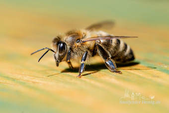 Das Bild gehört zur Serie "Saalfelder Honig", aufgenommen vom Imker Bernd Rümpler, Inhaber von saalfelder-honig.de. Zu sehen ist eine weibliche Honigbiene (Arbeiterin).