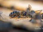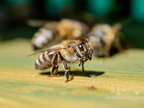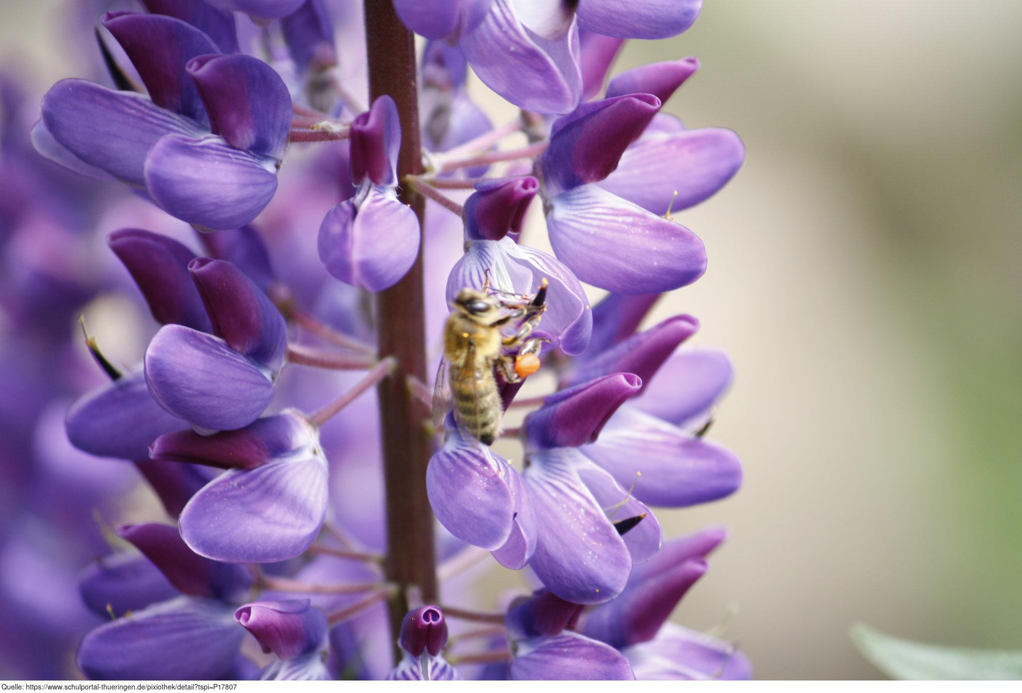 Das Bild gehört zur Serie "Saalfelder Honig", aufgenommen vom Imker Bernd Rümpler, Inhaber von saalfelder-honig.de. Zu sehen ist eine Honigbiene (Flugbiene) auf der Blüte einer Lupine. Sie klebt Pollen an ihre Hinterbeine, indem sie diesen mit körpereigenen Stoffen vermischt (Pollenhöschen).