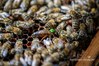 Das Bild gehört zur Serie "Saalfelder Honig", aufgenommen vom Imker Bernd Rümpler, Inhaber von saalfelder-honig.de. Zu sehen ist eine Bienenkönigin (gezeichnet) umringt von Arbeiterinnen (Stockbienen) auf der Suche nach geputzten Zelle, in welche sie jeweils ein Ei ablegen kann.