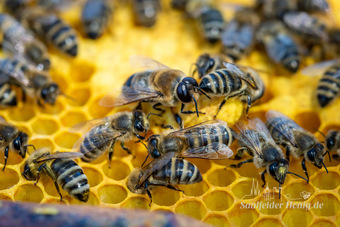 Bienenkönigin umringt von Arbeiterinnen