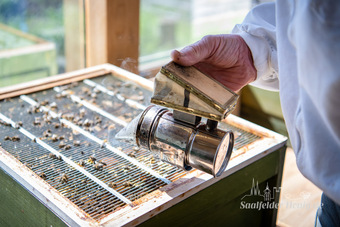 Das Bild gehört zur Serie "Saalfelder Honig", aufgenommen vom Imker Bernd Rümpler, Inhaber von saalfelder-honig.de. Zu sehen ist ein Imker am geöffneten Bienenvolk mit Smoker.