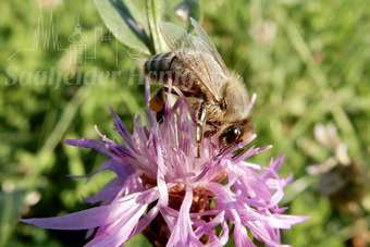 Das Bild gehört zur Serie "Saalfelder Honig", aufgenommen vom Imker Bernd Rümpler, Inhaber von saalfelder-honig.de. Zu sehen ist eine Flugbiene auf einer Kornblume. Die Biene klebt Pollen an ihre Hinterbeine, indem sie diesen mit körpereigenen Stoffen vermischt - Pollenhöschen – In ihrem Fell haften sich Pollenkörnchen an, durch welche dann auf der nächsten Blüte deren Befruchtung erfolgt. Mit dem Rüssel nimmt sie am Blütengrund Nektar auf und transportiert diesem im Honigmagen zum Bienenstock. Es gelten die Nutzungsbedingungen der Mediothek und Pixiothek.
