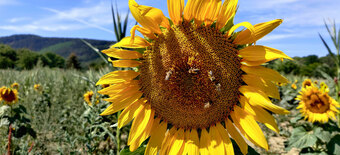 Das Bild gehört zur Serie "Saalfelder Honig", aufgenommen vom Imker Bernd Rümpler, Inhaber von saalfelder-honig.de. Zu sehen sind Flugbienen auf der Blüte einer Sonnenblume. Es gelten die Nutzungsbedingungen der Mediothek und Pixiothek.