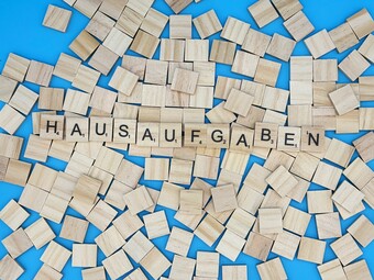 Aus Buchstaben wurde das Wort "Hausaufgaben" gelegt. Es gelten die Nutzungsbedingungen der Mediothek und Pixiothek.