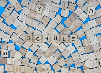 Aus Buchstaben wurde das Wort "Schule" gelegt. Es gelten die Nutzungsbedingungen der Mediothek und Pixiothek.
